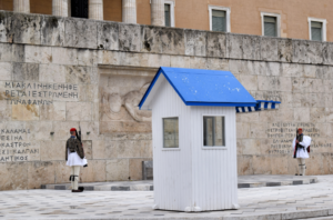 Daca vrei sa vizitezi Atena, ai grija sa cuprinzi si ziua de duminica in perioada petrecuta acolo. Duminica, la ora 11:00 a.m. se schimba garda la Parlament. Cei doi militari Evzoni care pazesc mormantul soldatului necunoscut sunt schimbati de catre alti doi militari. Totul are loc intr-o ceremonie fastuoasa care include marsul intregii garzi, insotita de o fanfara; toti membrii sunt imbracati in costumele traditionale. Am luat parte, in a doua zi de vacanta, la un eveniment fastuos, ceremonia fiind una foarte bine pusa la punct, pana la cel mai mic detaliu, intr-un sincron perfect.