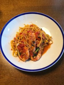 Dupa putin timp de asteptare a sosit si comanda; noi am ales o portie de paste cu fructe de mare si o alta portie de paste cu sos de rosii si busuioc. Sa stiti ca preparatele s-au ridicat la asteptarile noastre.