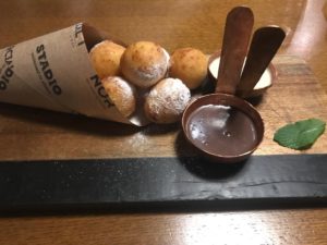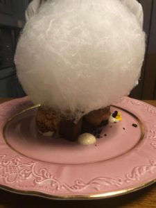 Pentru desert am ales norisorul de vata de zahar deasupra unui cuib de ciocolata, specialitatea casei si o portie de papanasi cu ciocolata. Daca pentru papanasi au reusit sa dea o nota moderna traditionalului preparat romanesc, fiind poate unii dintre cei mai buni pe care i-am mancat, nu pot sa spun acelasi lucru si despre cuibul de ciocolata. Chiar daca norisorul arata specataculos si reprezinta una dintre atractiile restaurantului, ciocolata a lasat putin de dorit.